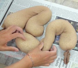 To begin, make your soft molds using thick stockings or tights and a filler that is going to be flexible and not too heavy. We use rice or lentils but you could use peas or small beans. Some have used sand (or grog) although it is important to note that when using a filler like sand choose a stocking that the filler will not leak through and consider that the sand will be heavy so the molds should be smaller. Knot the soft molds into varying sizes. Cover a sturdy wood board with newspaper (very important so that clay will not stick to board) and arrange the soft molds on the newspaper covered board.